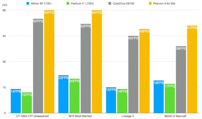 Benchmark: Athlon XP: Athlon XP 1700+, 1GB RAM, GeForce 4MX 64MB, SBLive! 5.1, HDD 40GB Pentium 4: Pentium 4 1.7GHz, 1GB RAM, GeForce 4MX 64MB, SBLive! 5.1, HDD 40GB Core2Duo: C2D E6750, 4GB RAM, GeForce 8600 GT, SB Audigy, 500GB HDD Phenom: Phenom II X4 955, 8GB RAM, Radeon HD 6790, 500GB HDD
